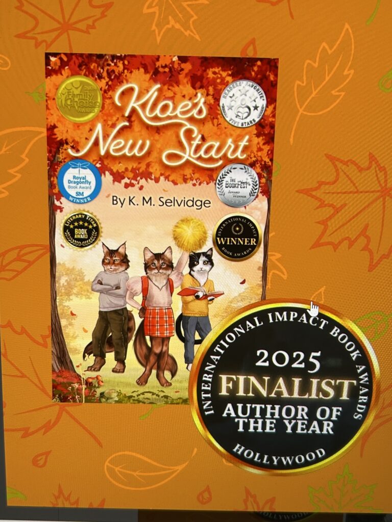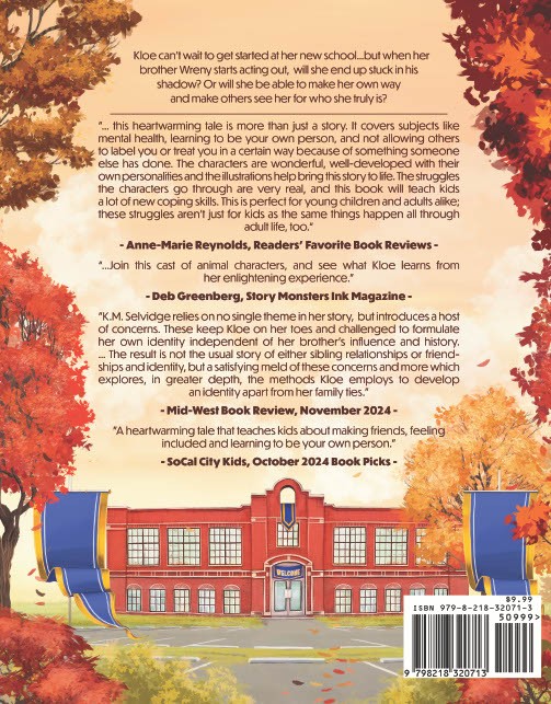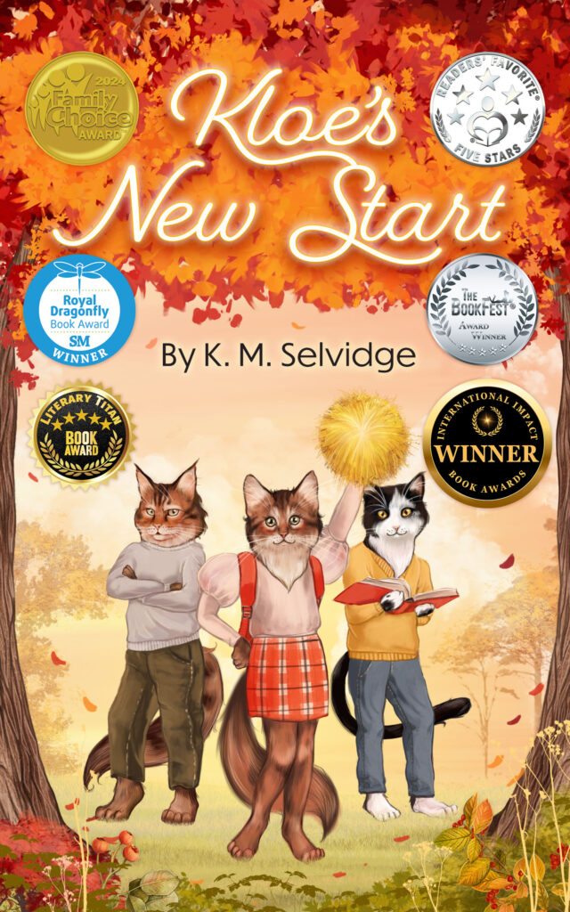 “Kloe’s New Start by K.M. Selvidge is a children’s story about Kloe the cat. Kloe is about to start a new school, and she’s excited beyond belief. Even more so when her best friends Terry Turkey and Ginger Goat talk her into trying out for the cheerleading squad and she makes the grade. But her brother Wreny gets into a fight and is sent home on the first day, and then flies into a rage for no reason with her. The next day, word has gone around that she is Wreny’s sister and people turn their backs on her. Can she show them that she’s more than that? That she’s her own person? Or will she always be treated as an outcast and seen as a troublemaker? And what’s really wrong with Wreny?